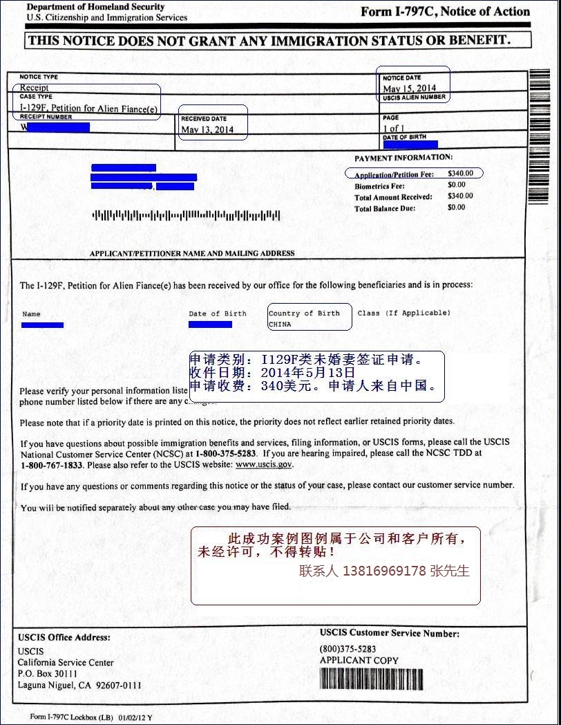 2014年5月成功案例:美国K1签证申请客户成功递交申请并收到移民局接收信!