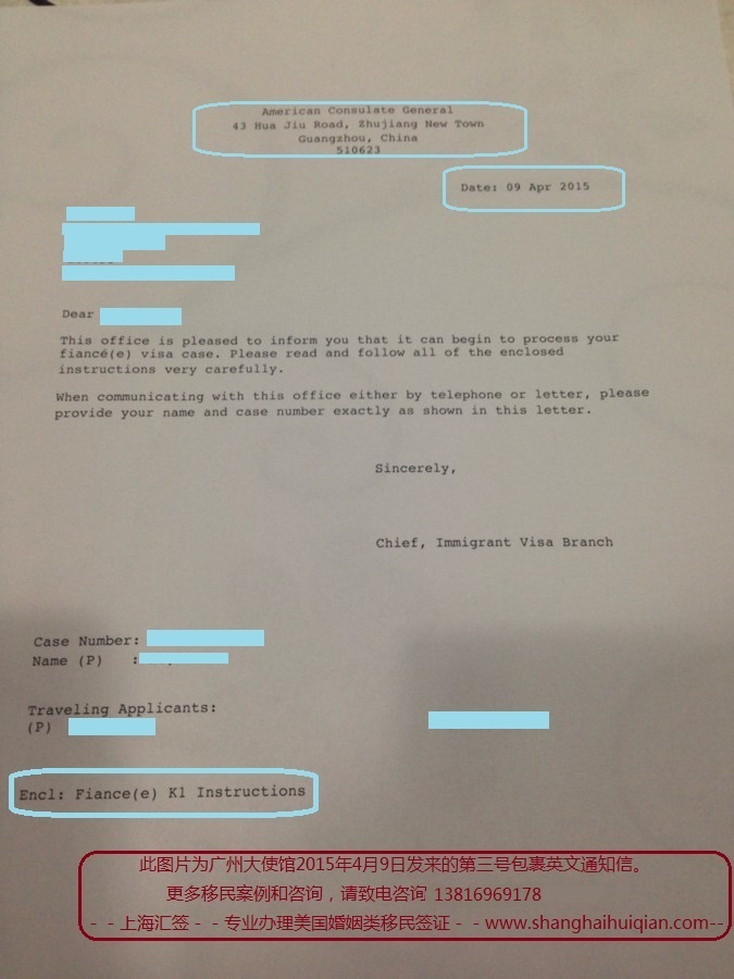 2015年4月,我公司美国K1签证申请客户成功获得美国驻广州移民签证部发来的第三号包裹PACKAGE3英文信!