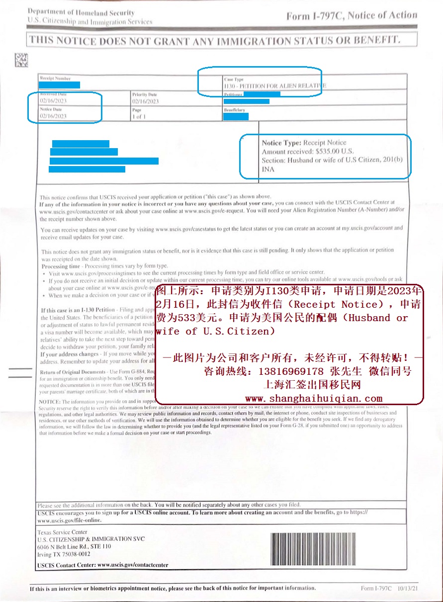 2023年2月16日,我公司美国CR1婚姻移民签证客户成功在线递交I-130申请至美国移民局USCIS,并收到接收信(Receipt Notice)!